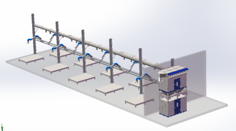 在涂裝生產(chǎn)線現(xiàn)場分散布置有5套廢溶劑收集裝置,1套分布于中涂線(包括8臺機(jī)器人和10個(gè)手工噴漆點(diǎn)),2套分布于面漆色漆線(包括8臺機(jī)器人和16個(gè)手工噴漆點(diǎn))