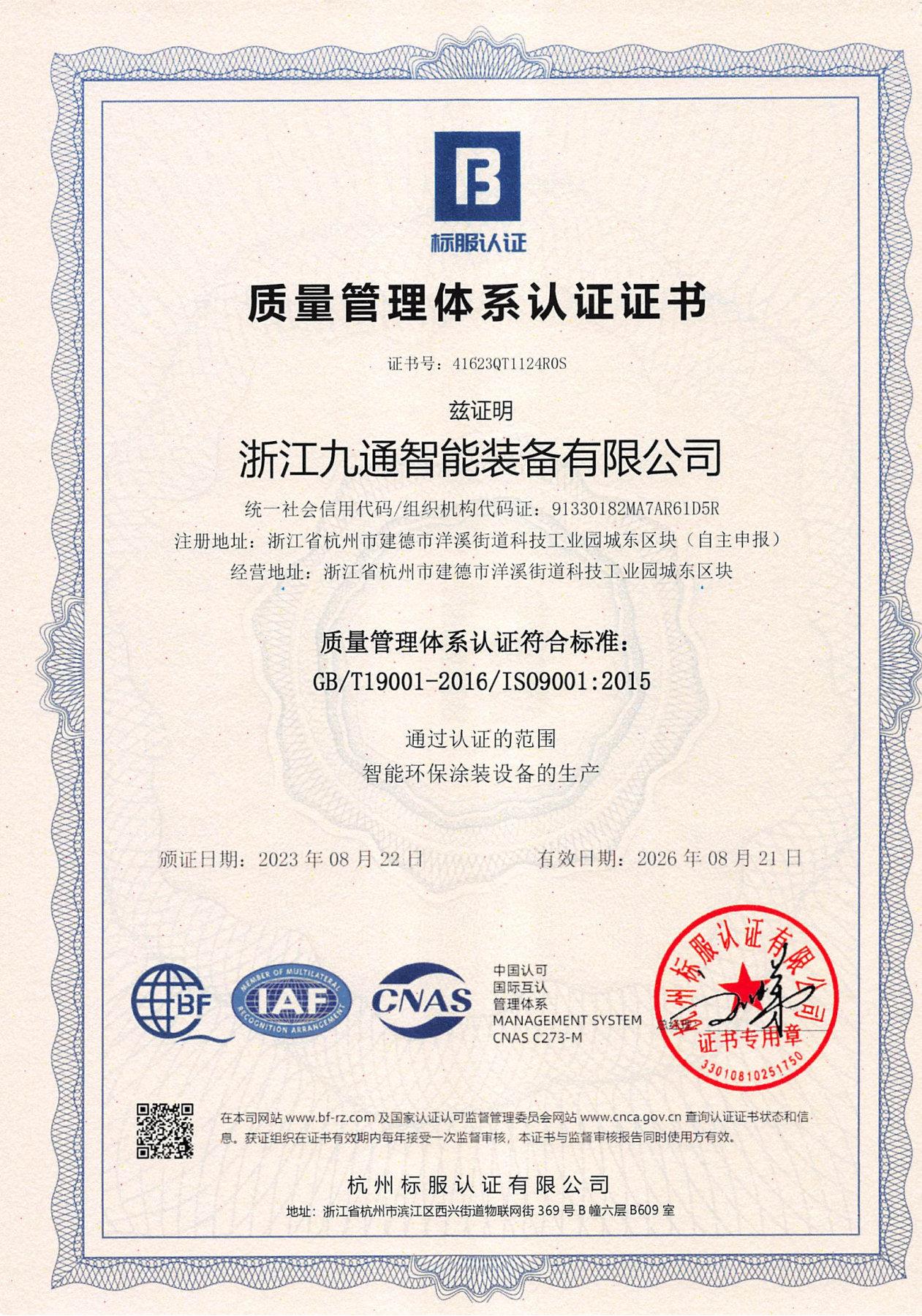 浙江九通智能裝備有限公司簡稱九通,由“譽(yù)滿九州 廣陌通衢”而來,成立于2011年,專注于智能環(huán)保涂裝整體解決方案系統(tǒng),是一家集咨詢、勘察、設(shè)計(jì)、研發(fā)、生產(chǎn)、銷售、安裝、調(diào)試、交付、運(yùn)維于一體的專業(yè)服務(wù)廠商,研發(fā)總部位于北京,生產(chǎn)基地設(shè)立于浙江、山東、廣東。產(chǎn)品包括涂裝生產(chǎn)線、噴砂房、噴漆房、涂裝機(jī)器人、烤漆房、噴漆烘干一體房、除塵設(shè)備、有機(jī)廢氣處理設(shè)備等,客戶群體包括風(fēng)電、軌道交通、航空航天、專用車、汽車、結(jié)構(gòu)件、石油裝備、工程機(jī)械、礦工機(jī)械等領(lǐng)域,項(xiàng)目經(jīng)驗(yàn)豐富!